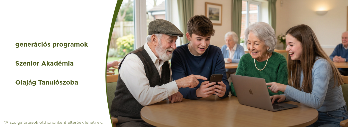 Otthonainkban működik az élethosszig tartó tanulást, folyamatos ismeretszerzést támogató Senior Akadémia, a különböző korosztályok találkozásait lehetővé tevő Generációs programok – bölcsődésektől a felnőttekig -, és az egyéni, dédelgetett álmok megvalósítását célul tűző Bakancslista program is. A velünk élők aktivitási igényét széleskörű senior sportkínálattal támogatjuk, a senior örömtánctól a Nordic Walking gyaloglóklubokon át az egyensúlytréningig és még tovább.